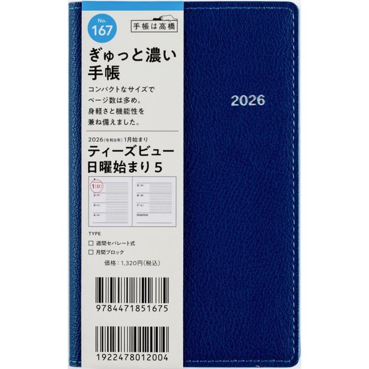 - 2025年12月始まり手帳 週間ブロック B7 ティーズビュー5(167)ネイビー