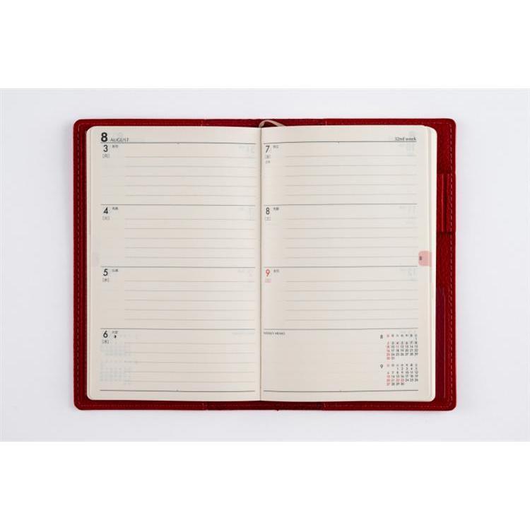 カバーは、高級感がある皮革調。カバーのステッチ糸も、カバー色に合わせて選び抜いています。本文は、目にやさしいクリーム色の用紙を使用しています。細部にまでこだわり抜いた手帳は、毎日使うのがきっと楽しくなるはずです。