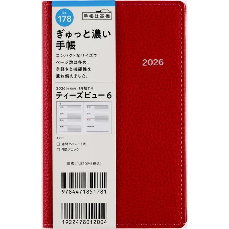 2025年12月始まり手帳 週間ブロック B7 ティーズビュー6(178)レッド