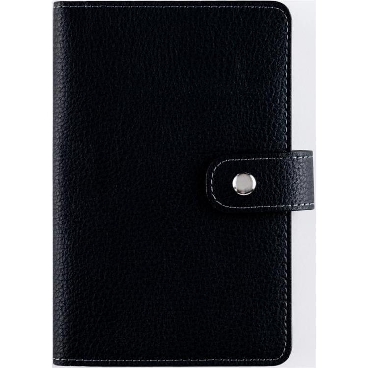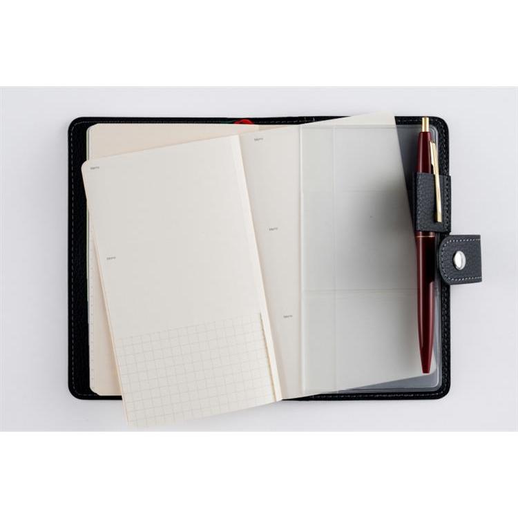 カバンの中で手帳が開いてしまう心配も、ベルト付きなら安心!カバーは皮革調の濃淡が高級感を演出するブラック。ポケット数が多いのも特徴で、クリア素材のフリーポケットもついているため、手帳にたくさん挟みたい方におススメです。