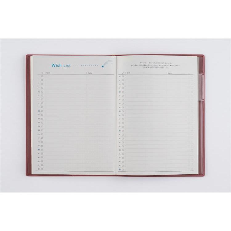 1日ごとの記入スペースが広い「週間ブロック式」は、その日の出来事やTo Doなど、使い方は自由自在。巻末には、やりたいこと、行きたい場所など自由に描ける付録も充実。