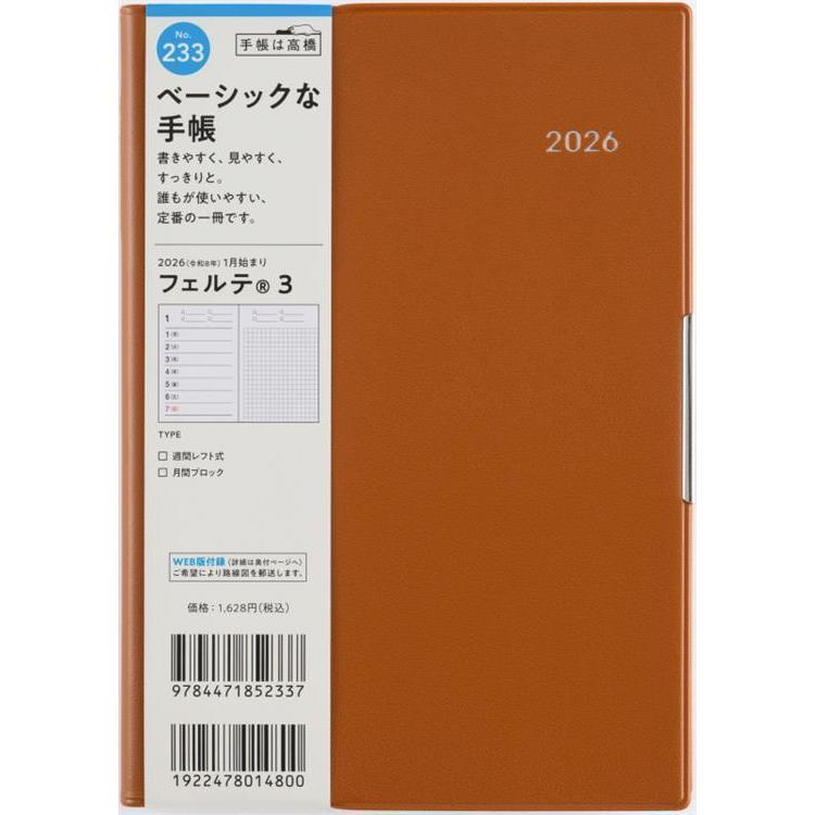 - 2025年12月始まり手帳 週間レフト B6 フェルテ3(233)キャラメル