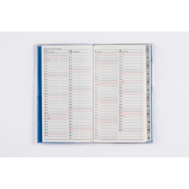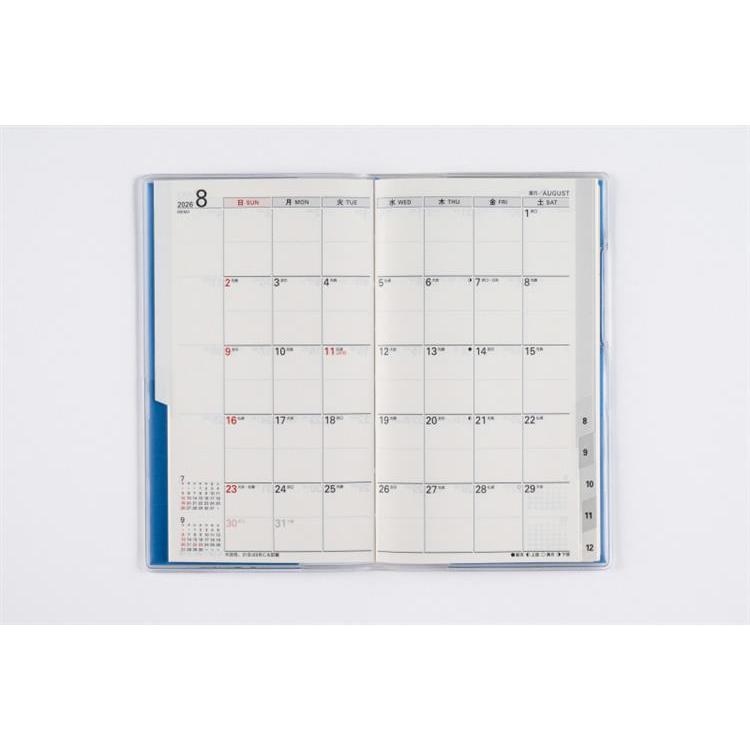 「薄さ」と「軽さ」が人気の土日均等タイプ。1冊目にはもちろん、趣味用のサブ手帳としてもオススメ。月別インデックス付き。