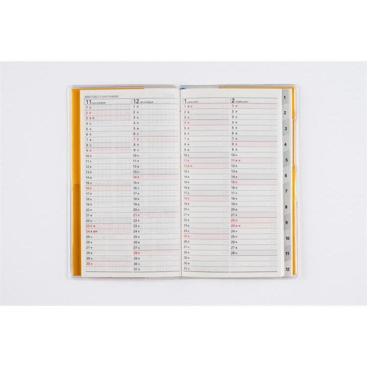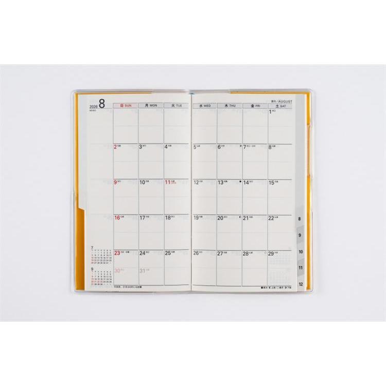 「薄さ」と「軽さ」が人気の土日均等タイプ。1冊目にはもちろん、趣味用のサブ手帳としてもオススメ。月別インデックス付き。
