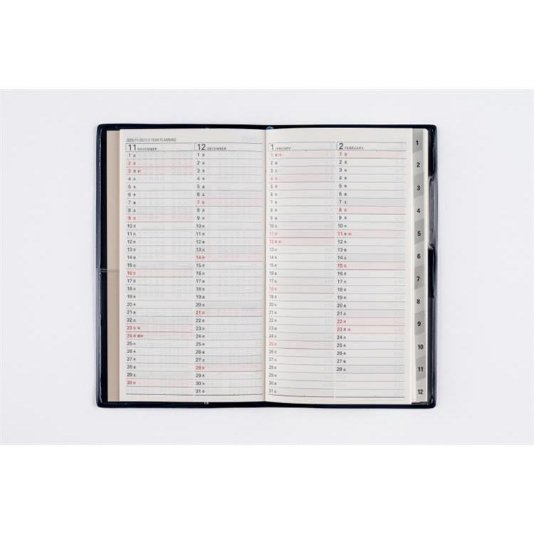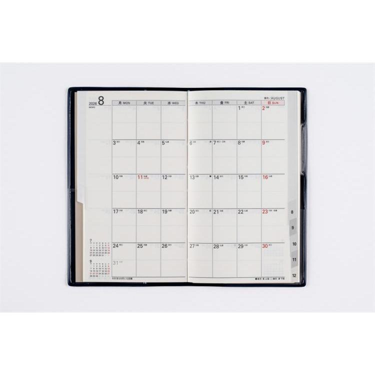 「薄さ」と「軽さ」が人気の土日均等タイプ。1冊目にはもちろん、趣味用のサブ手帳としてもオススメ。月別インデックス付き。