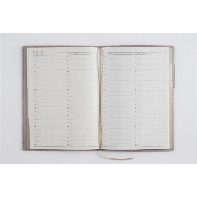 落ち着いた大人っぽい装丁。ベーシックなB6判で、開くのに便利なインデックス付き。巻末には「Wish List」などの付録も充実。