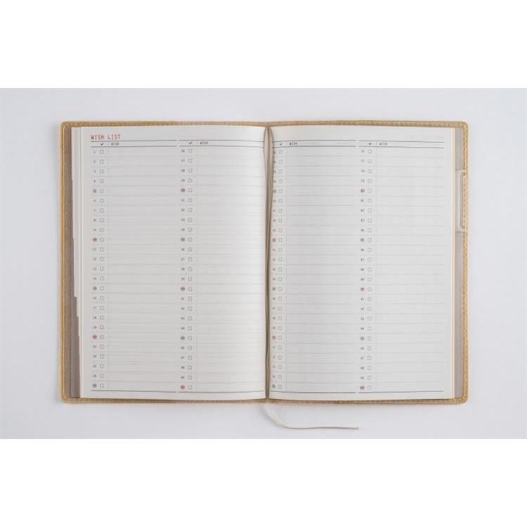 落ち着いた大人っぽい装丁。ベーシックなB6判で、開くのに便利なインデックス付き。巻末には「Wish List」などの付録も充実。
