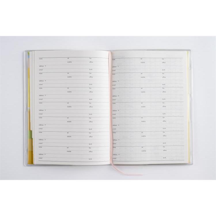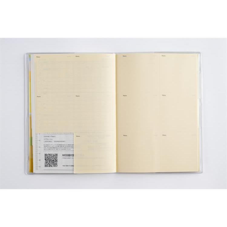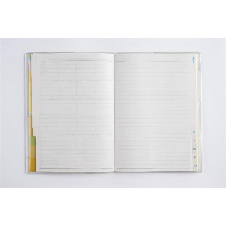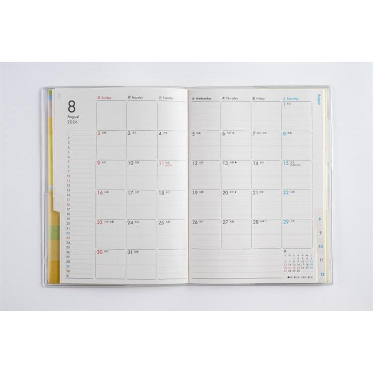 月間予定表のみの薄型タイプで、持ち運んで気軽に使いやすいベーシックなB6判。便利な月別インデックス付きなので、見たいページをパッと開けます。