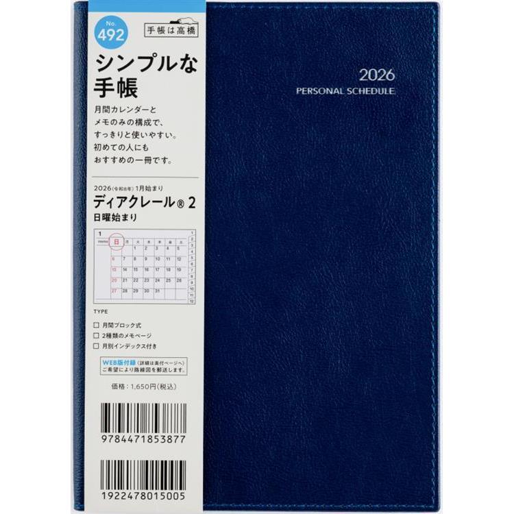 2025年12月始まり手帳 月間 B6 ディアクレール2(492)ネイビー