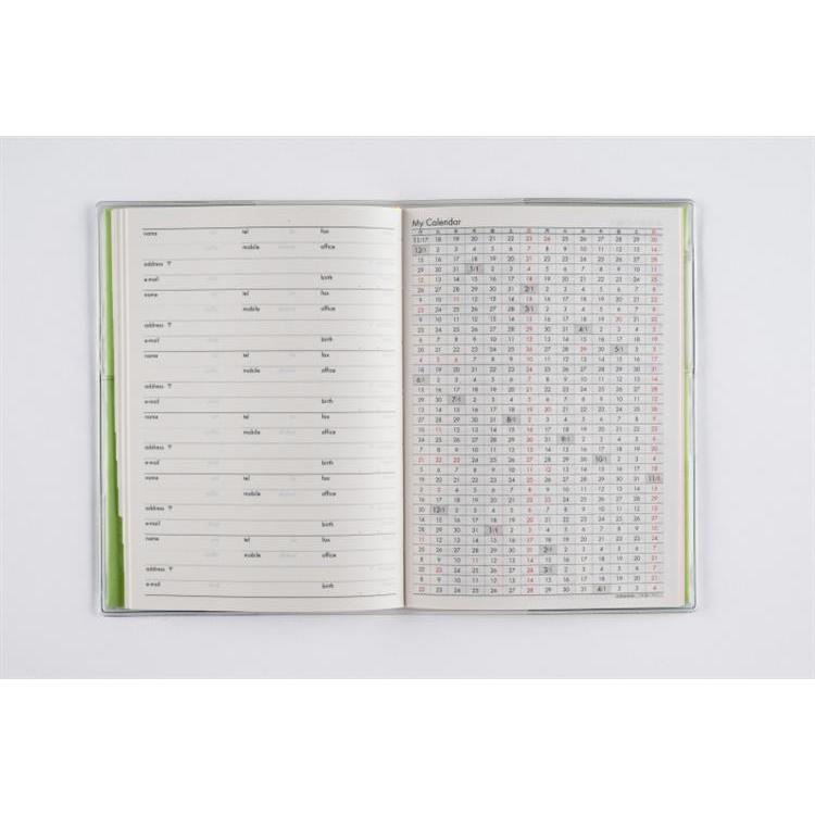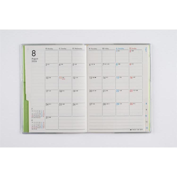 月間予定表のみの薄型タイプで、小さなカバンにもおさまりやすいハンディサイズ! 便利な月別インデックス付き。
