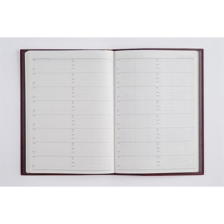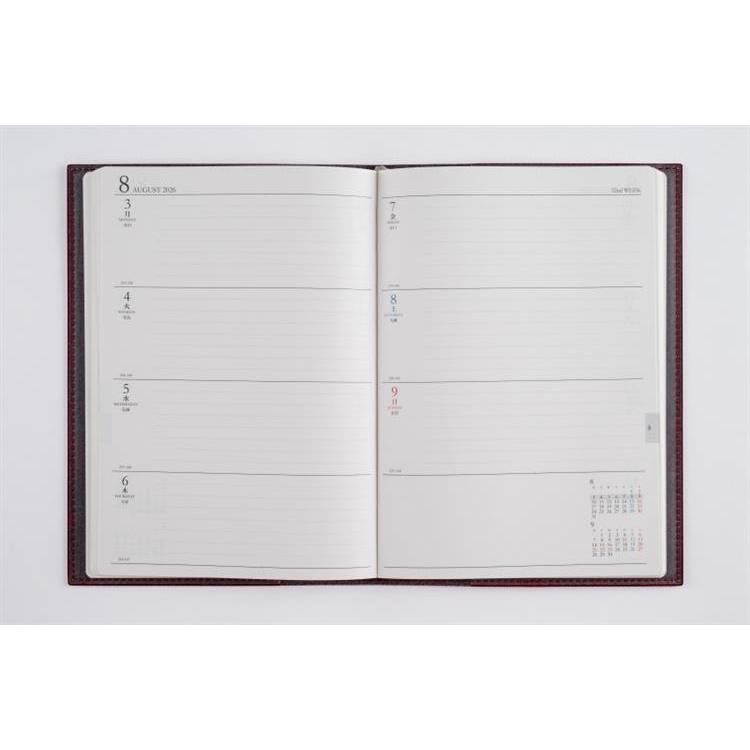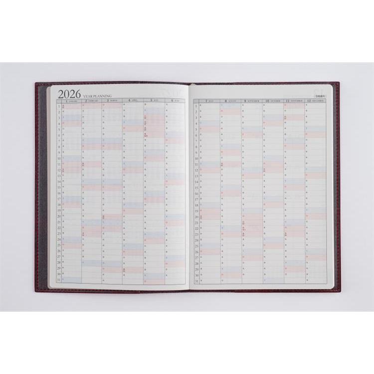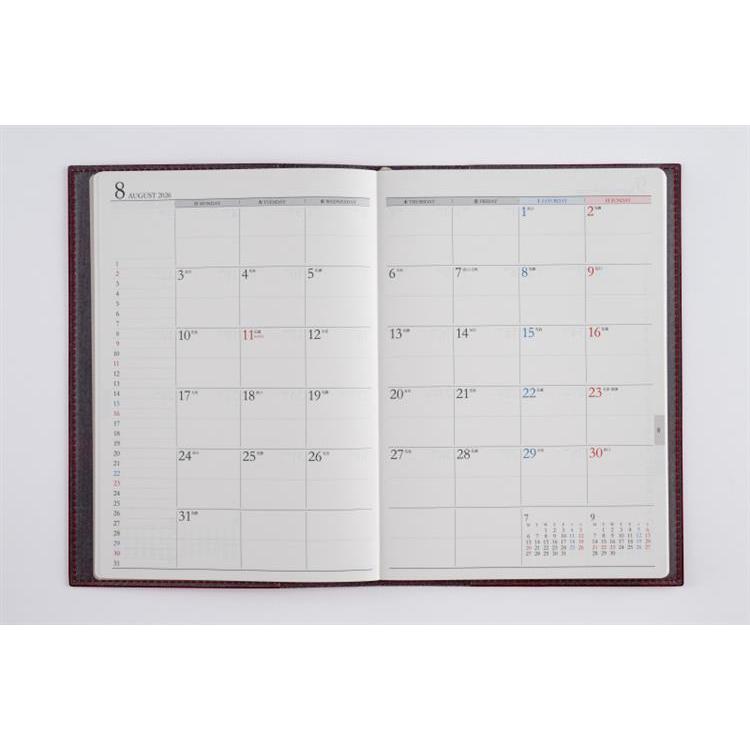 スタンダードな記入形式、上品なフォント、見やすく紙面になじむ刷色など、ストレスなくお使いいただけるのが人気の理由です。月間ページがまとまった月間集約型のページ構成は、月をまたぐ予定管理に便利。