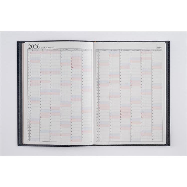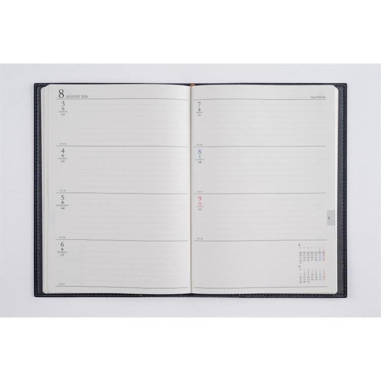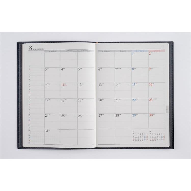 スタンダードな記入形式、上品なフォント、見やすく紙面になじむ刷色など、ストレスなくお使いいただけるのが人気の理由です。月間ページがまとまった月間集約型のページ構成は、月をまたぐ予定管理に便利。