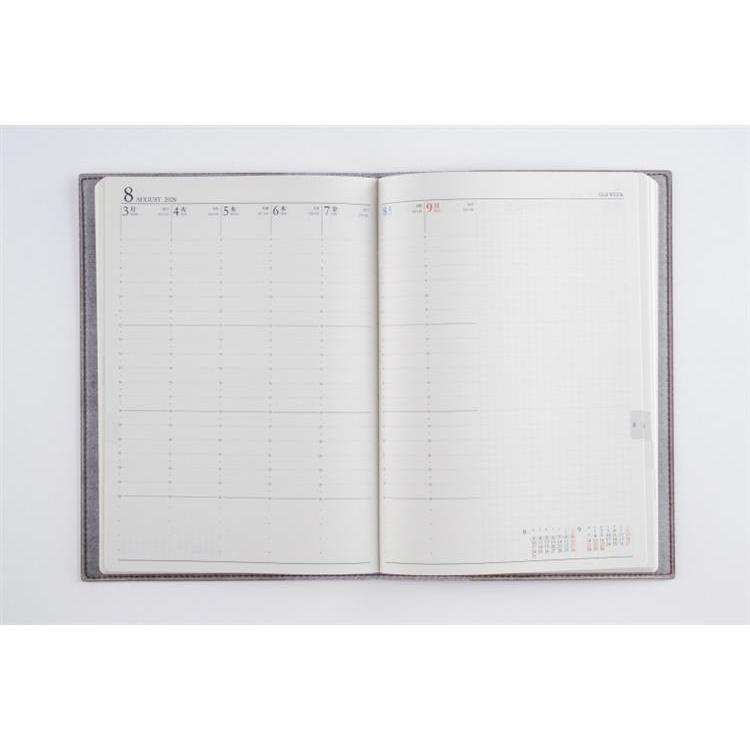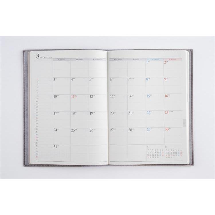 スタンダードな記入形式、上品なフォント、見やすく紙面になじむ刷色など、ストレスなくお使いいただけるのが人気の理由です。月間ページがまとまった月間集約型のページ構成は、月をまたぐ予定管理に便利。