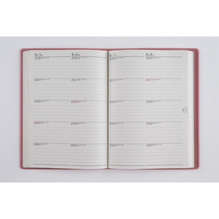 5年分の記録を書き込める連用ダイアリー。横ケイ式の月間ページは5年分の予定が一覧でき、ビジネスや年間行事などの管理に役立ちます。毎日取り出したくなる、ピンク色のカバー。