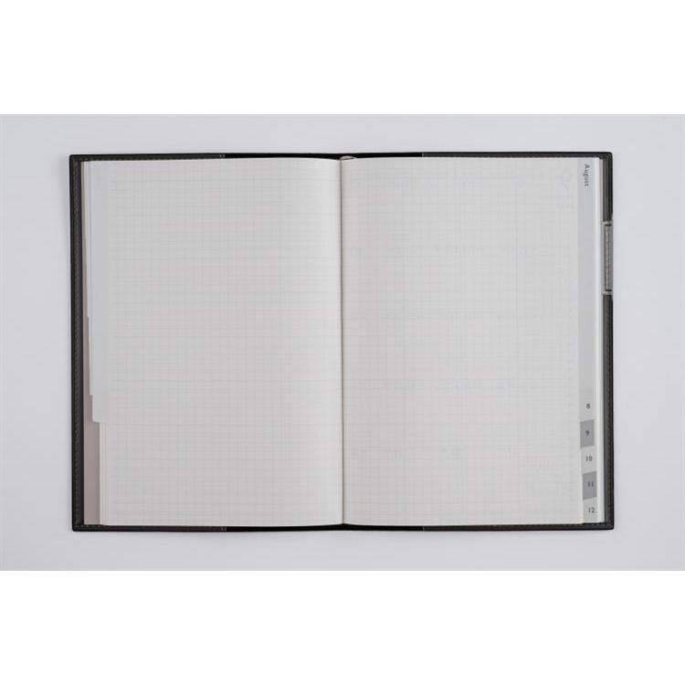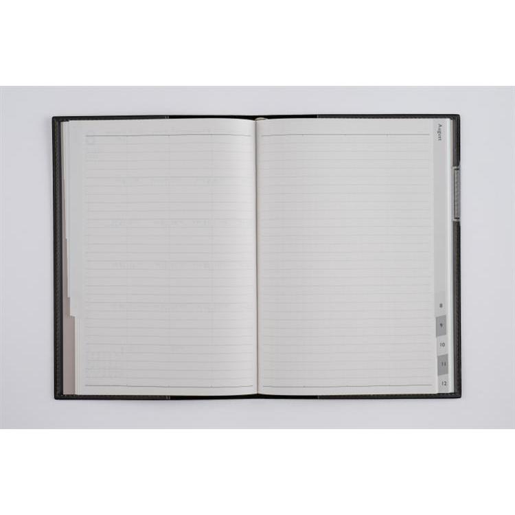 シックなカラーでステッチ入りのカバーは、毎年細部にまでこだわって製作しています。デスクで書くのにちょうどいいA5判で、マンスリータイプでもしっかり書きたい人にオススメです。