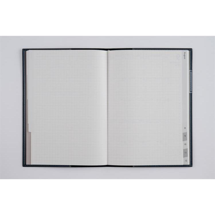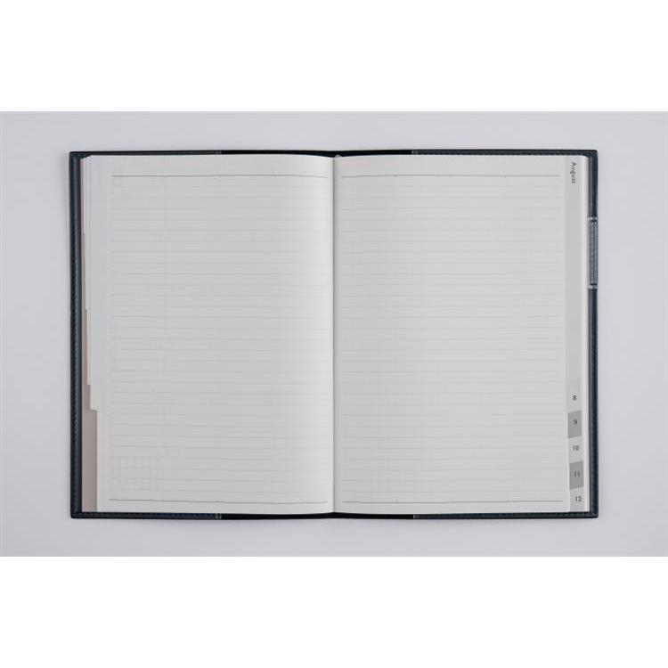 シックなカラーでステッチ入りのカバーは、毎年細部にまでこだわって製作しています。デスクで書くのにちょうどいいA5判で、マンスリータイプでもしっかり書きたい人にオススメです。