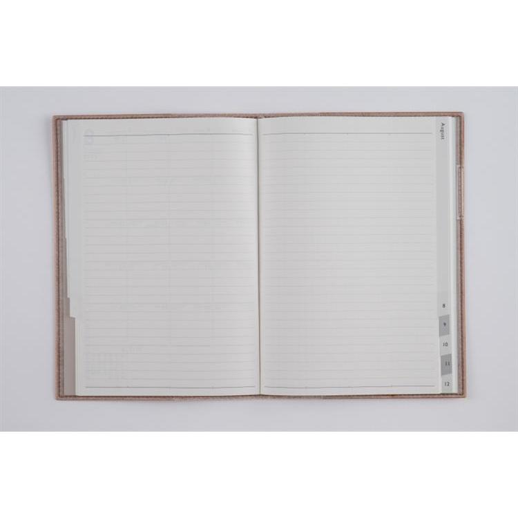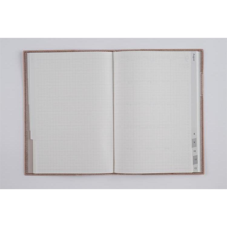 シックなカラーでステッチ入りのカバーは、毎年細部にまでこだわって製作しています。デスクで書くのにちょうどいいA5判で、マンスリータイプでもしっかり書きたい人にオススメです。