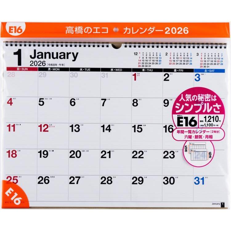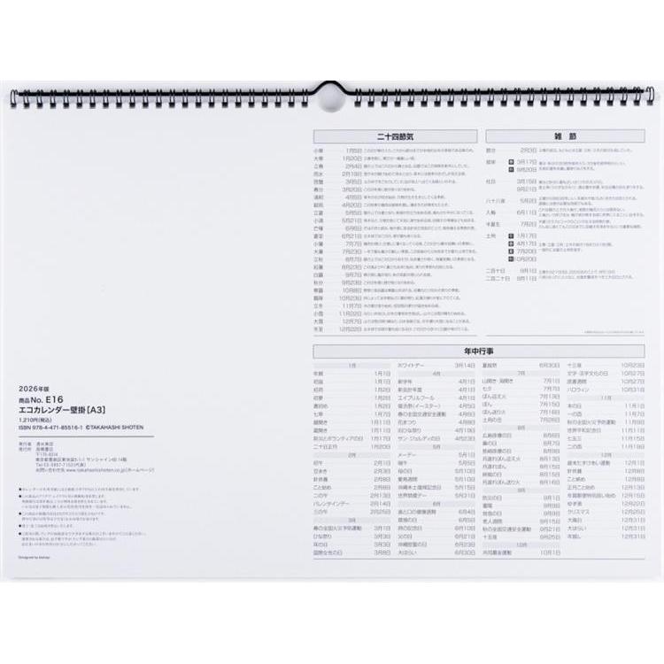 - 2026年1月始まり 壁掛け A3 エコカレンダー E16