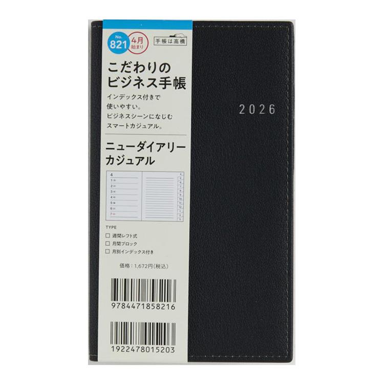 2026年3月始まり手帳 週間レフト B7 ニューダイアリーカジュアル(821)ブラック