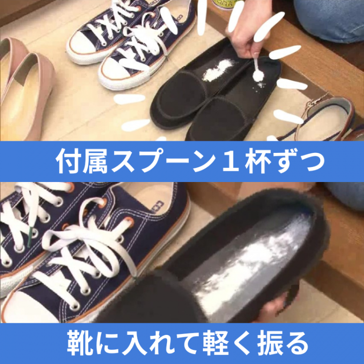 1.付属のスプーンにて、靴の片足分すりきり1杯の純白のパウダーを靴の中に散布。(大きな靴、ニオイが染みついてしまった靴なら少し多めに)