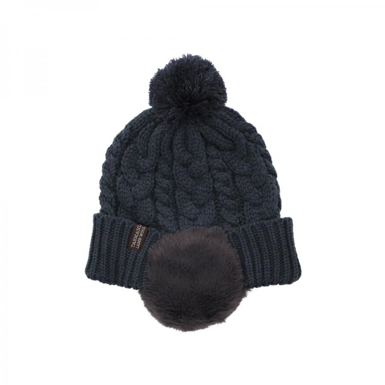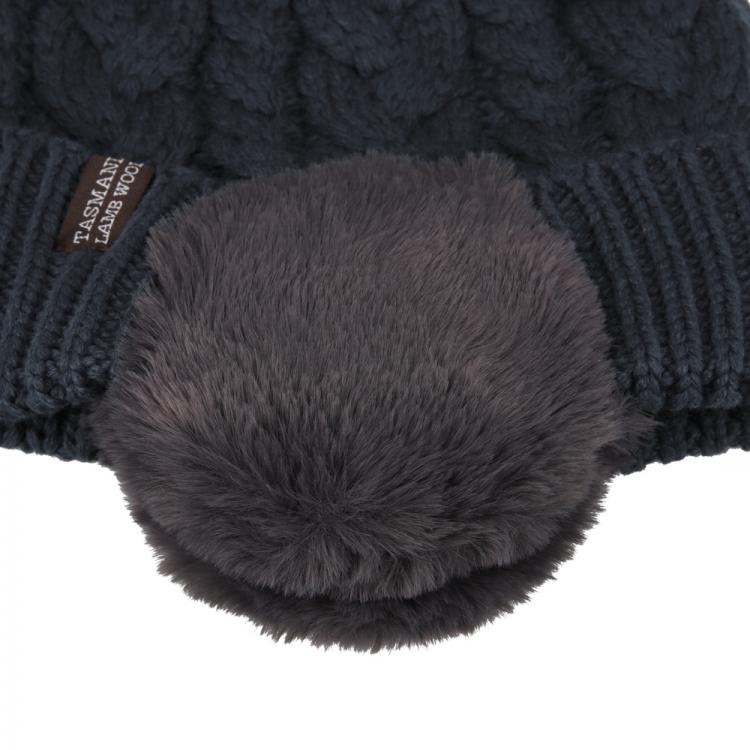 - ケーブル編みボア耳付ワッチ タスマニアラムウール ネイビー