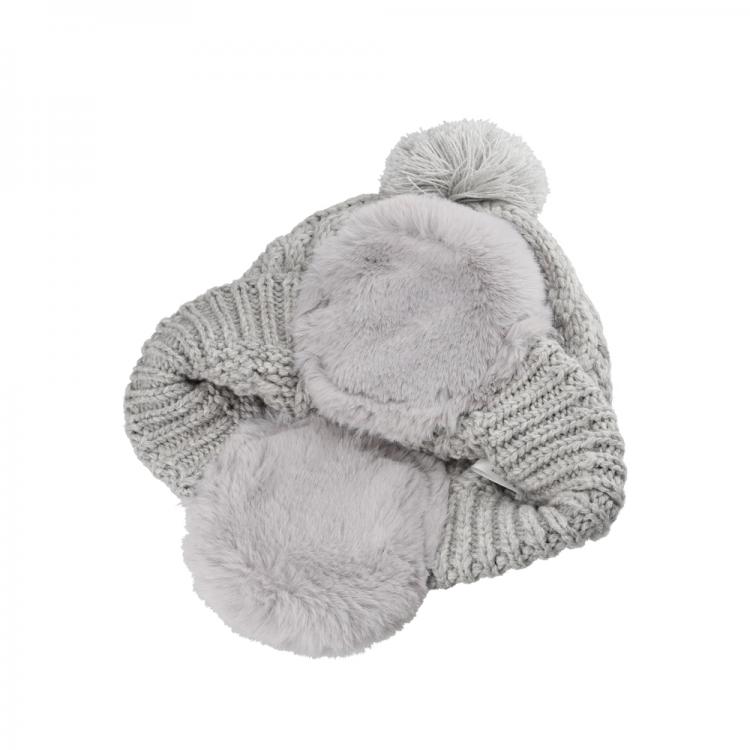 ボア素材の耳が付いたトレンド感のあるデザイン。ケーブル編みにすることで非常に柔らかい着心地に仕上げました。