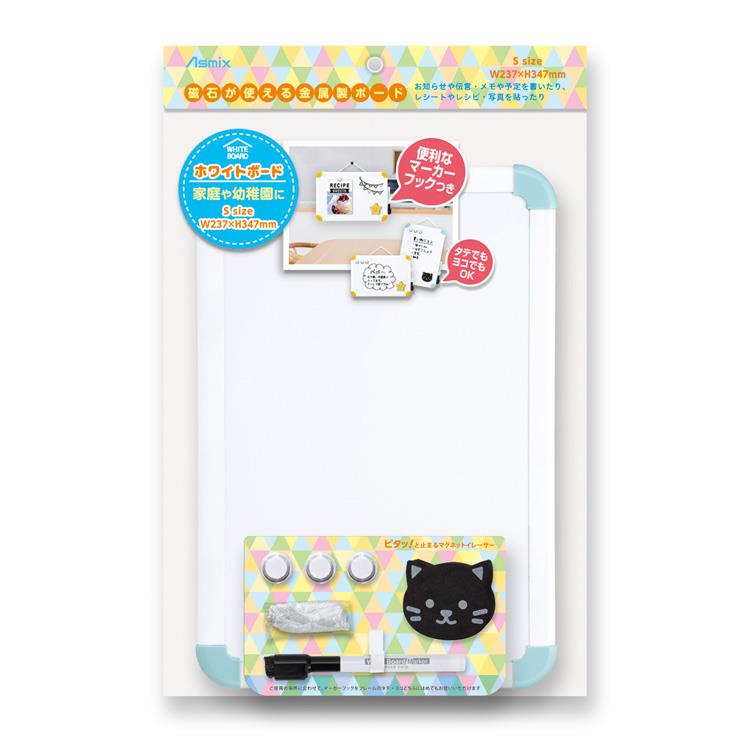 壁に掛けて使うための紐付きです。メモが貼れるマグネット付き。大きすぎないSサイズ。