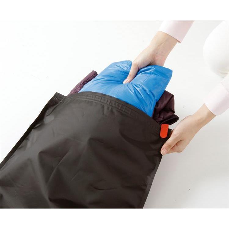 1.チャックを開いて収納袋に衣類などを入れます。バルブのロックが解除されていることを確認してください。