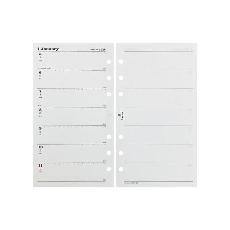 日付入りのダイアリーリフィルです。左ページに1週間分のダイアリー、右ページは日付ごとに区切られたフリースペースのメモ欄としてご使用いただけます。横軸には時間目盛りがついています。