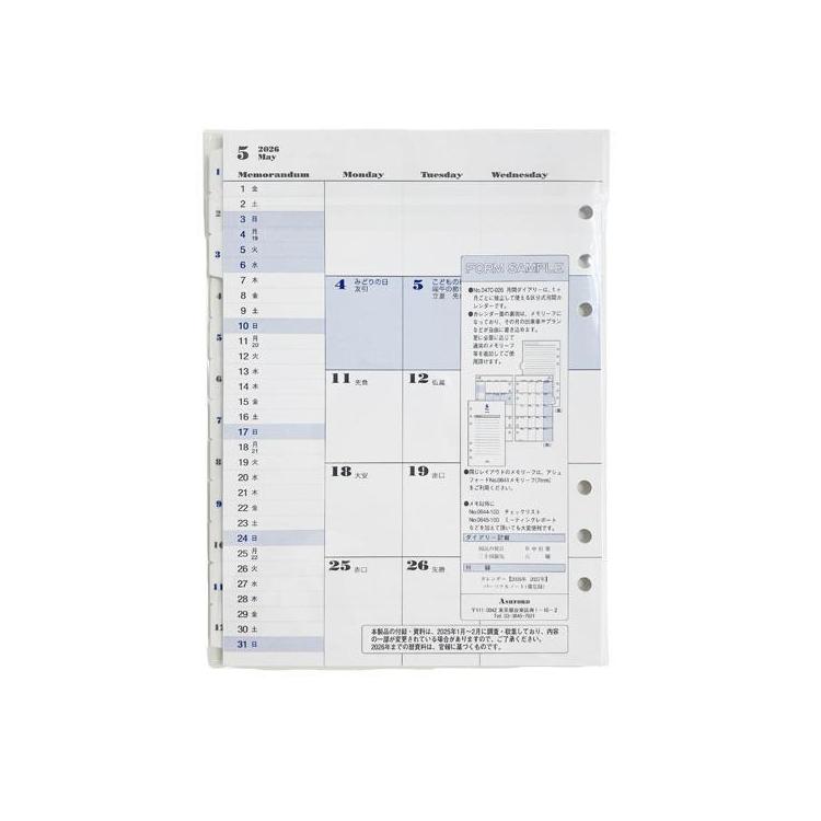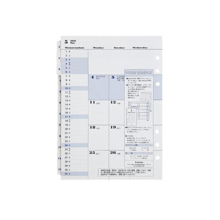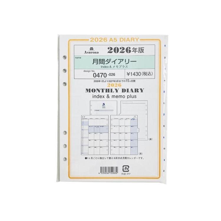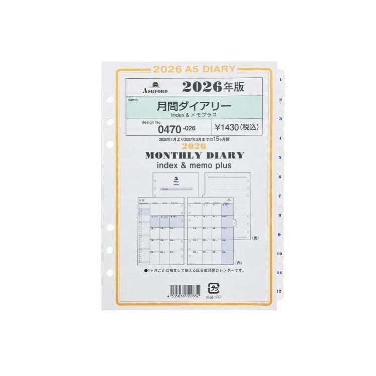 - 2026年1月始まりシステム手帳用リフィル A5 月間 Index&メモ