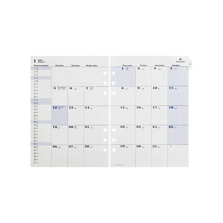2026年1月始まりシステム手帳用リフィル A5 月間 Index&メモ