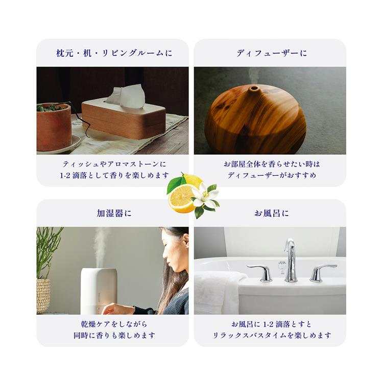ディフューザーでお部屋に香らせたり、ハンカチやティッシュなど、様々なかたちで香りを楽しめます。