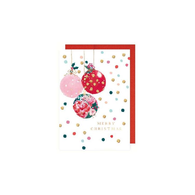 海外のデザイナーによるカラフルなグラスボールのイラストのクリスマスカードです。