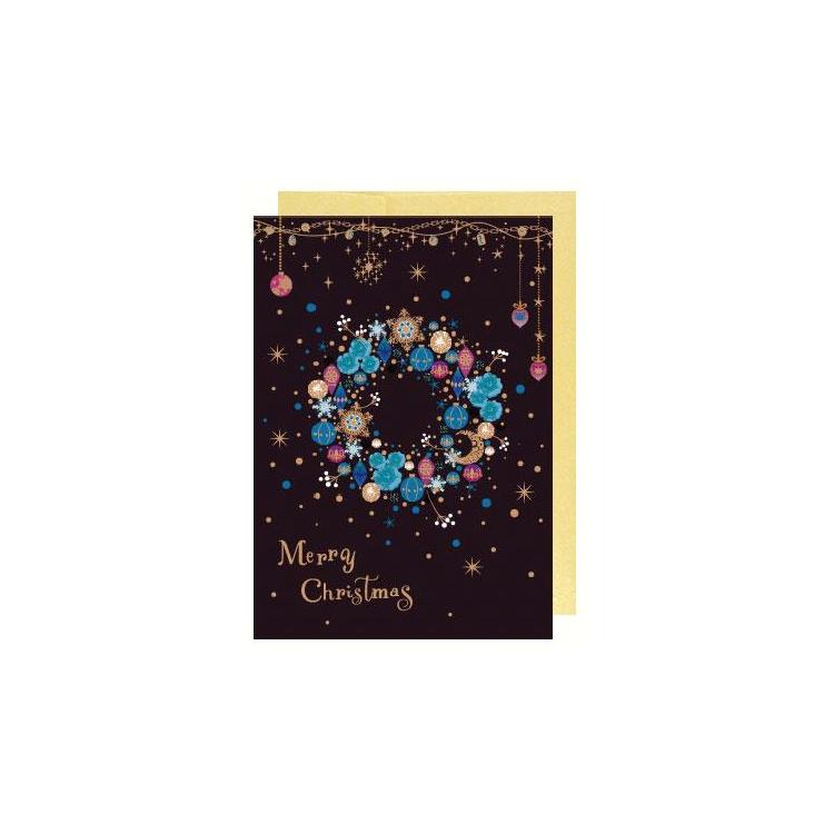 ブルーお花とグラスボールでリースをデコレーションした二つ折りクリスマスカードです。