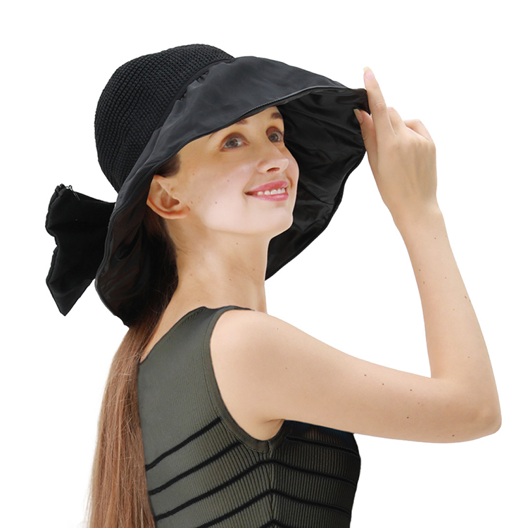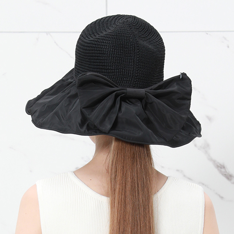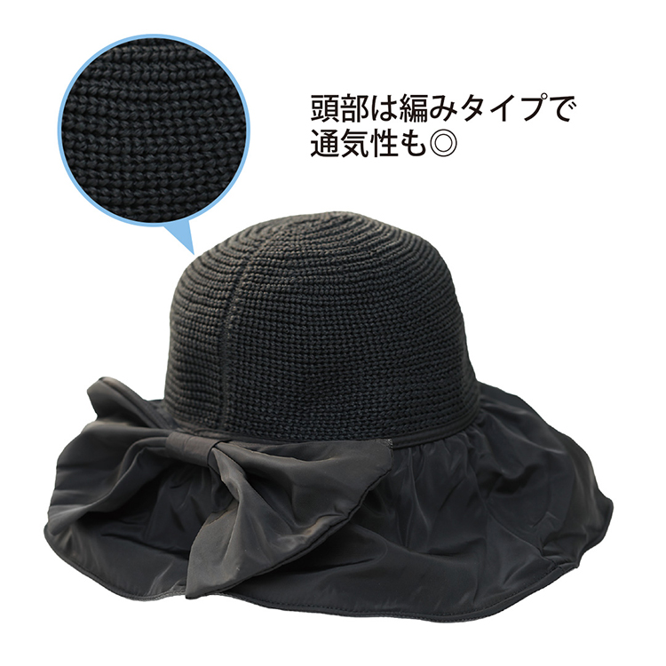 大きなリボンを帽子からしゅっと外すとそのままポーチとして使え、外出先で帽子が不要になった時などに、くるくるとたたんで収めればコンパクトになり便利。
