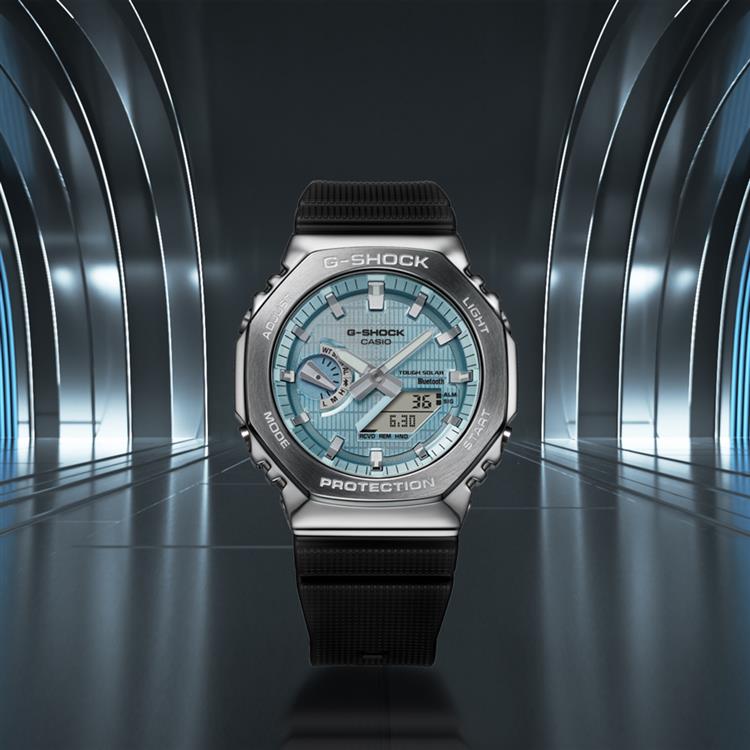 1983年の発売以来、飽くなき強さを求めて進化を続けるタフネスウオッチG-SHOCKから、2100シリーズの特徴であるスリムなサイズ感をキープしながら、スマートフォンリンクとタフソーラーを搭載したメタルカバードモデルです。