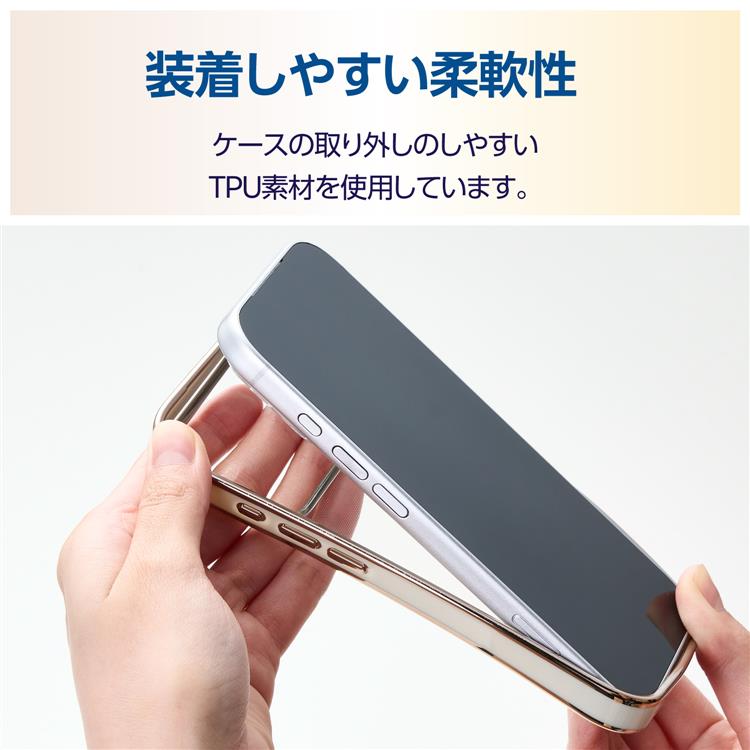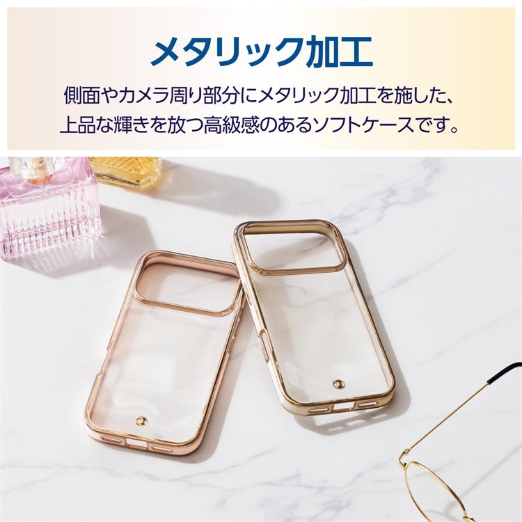 側面のエッジ部分やカメラ周り部分にメタリックラインを施した、上品な輝きを放つ高級感のあるソフトケースです。