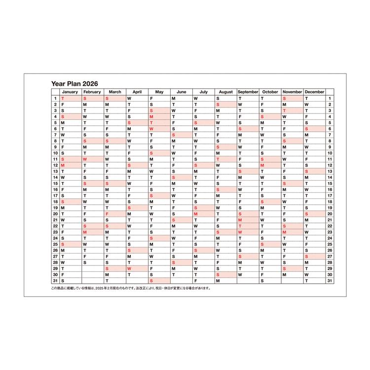 シーンを問わずに愛用できるシンプルなデザインで、カレンダー感覚で使える見やすさとたっぷり書き込めるメモページ付き。