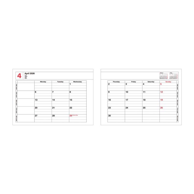 シーンを問わずに愛用できるシンプルなデザインで、カレンダー感覚で使える見やすさとたっぷり書き込めるメモページ付き。