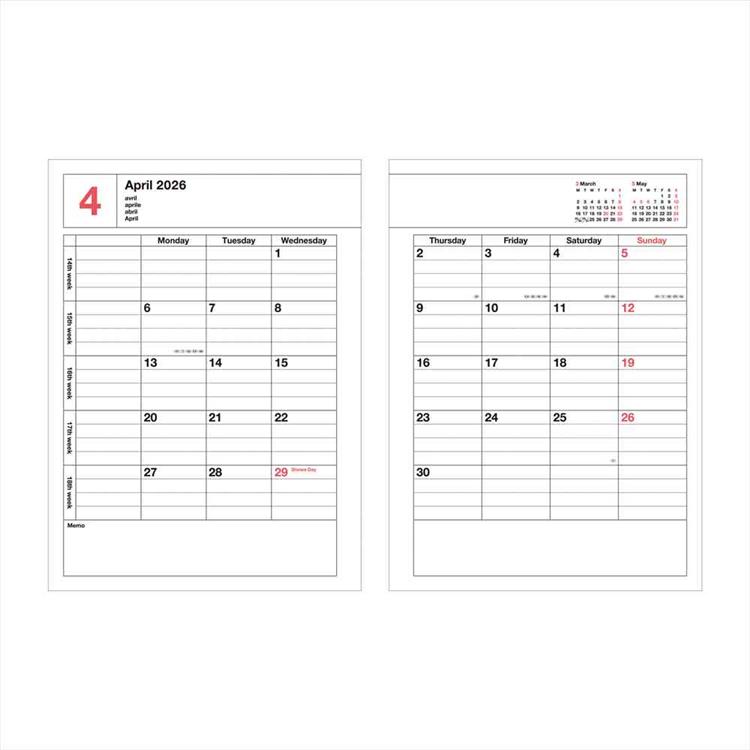 シーンを問わずに愛用できるシンプルなデザインで、カレンダー感覚で使える見やすさとたっぷり書き込めるメモページ付きです。