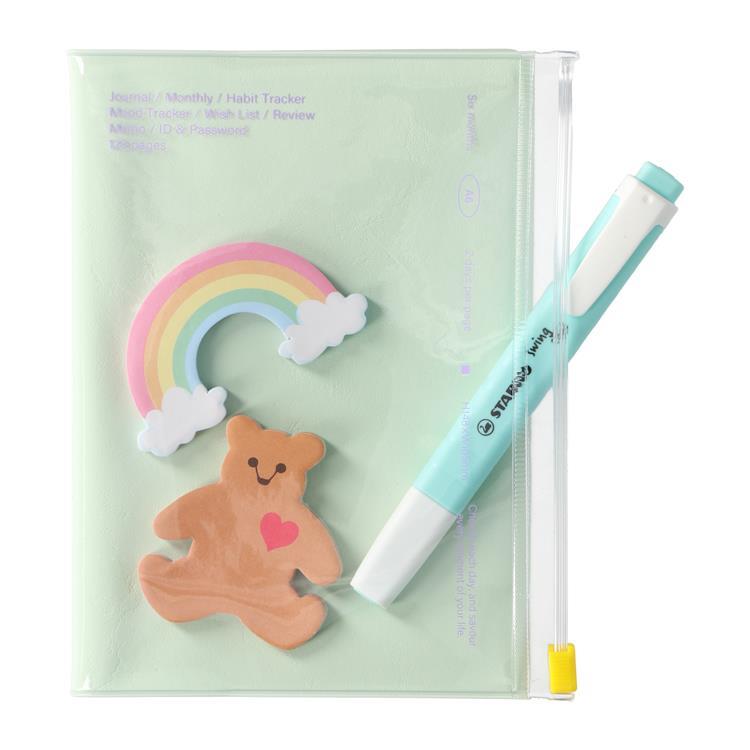 ジャケットはシンプルで落ち着いたパステルカラーのスライドジッパー式で、付せんやペンなどを一緒にまとめて携帯することができます。
