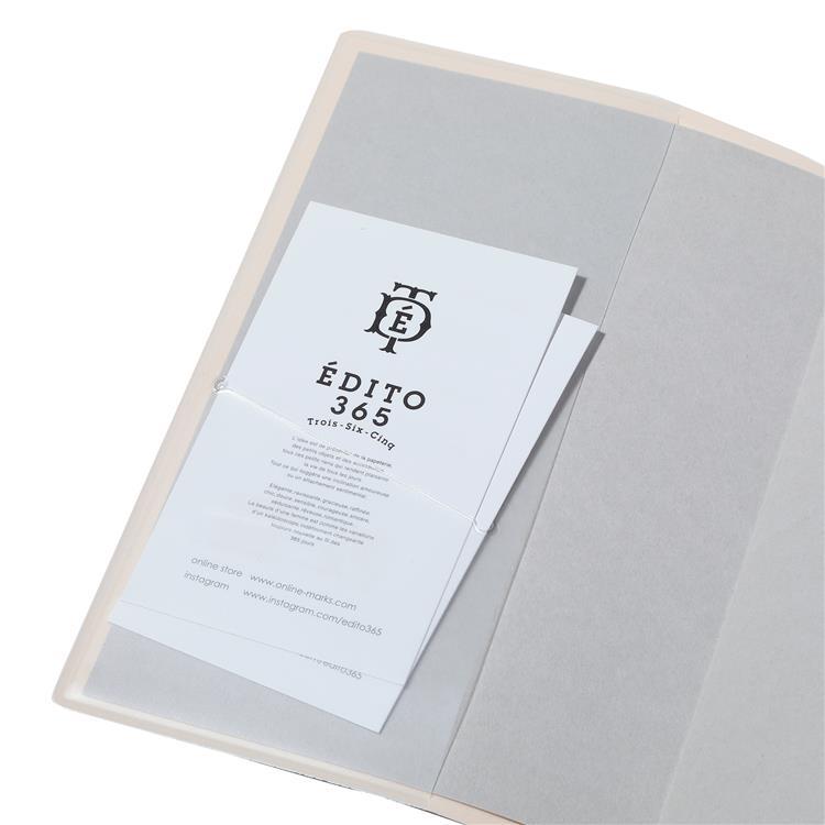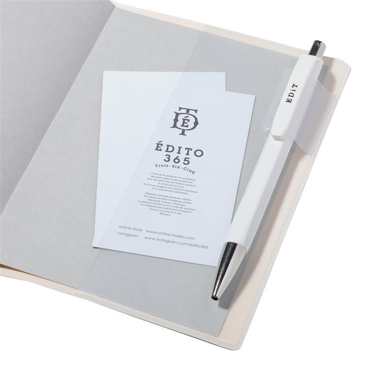 内側の片方にはチケットなどが挟めるスリットポケットが付き、もう片方には名刺サイズのカードが入るポケットとペンホルダーが付いています。