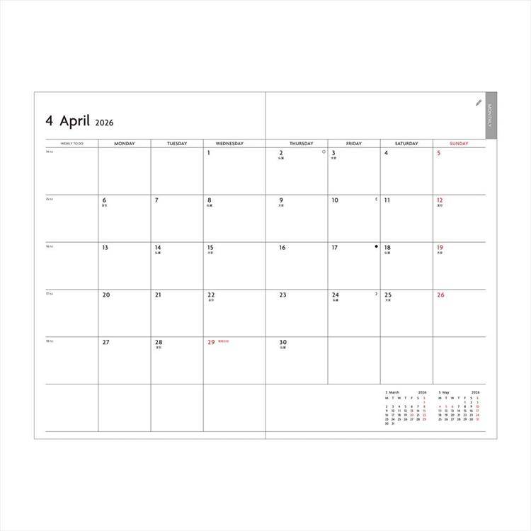・マンスリーページ:重要タスクやイベントがメモできる「ウィークリーTO DO欄」付き。