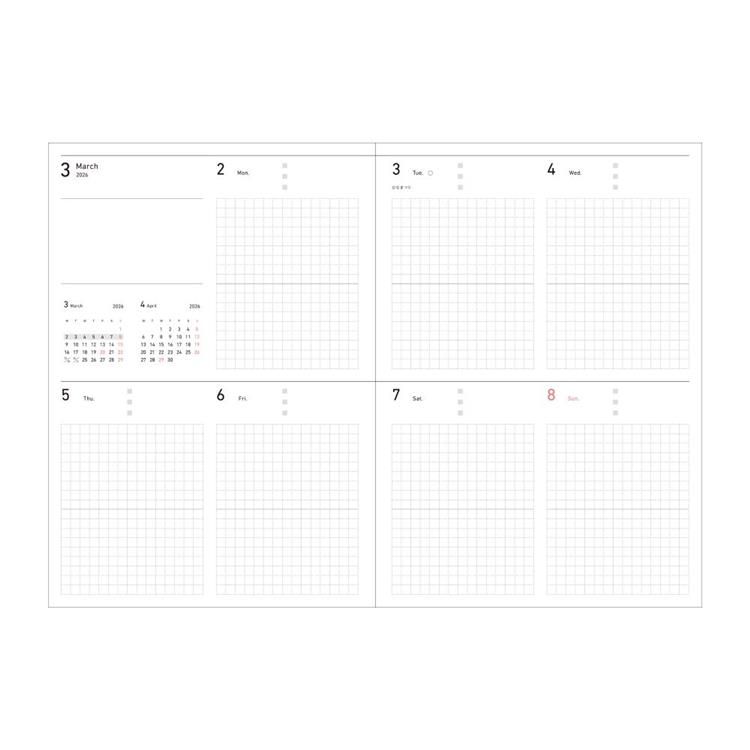- (マンスリーページ)2025.12~2027.01、(ウィークリーページ)2025.12.01~2027.01.03