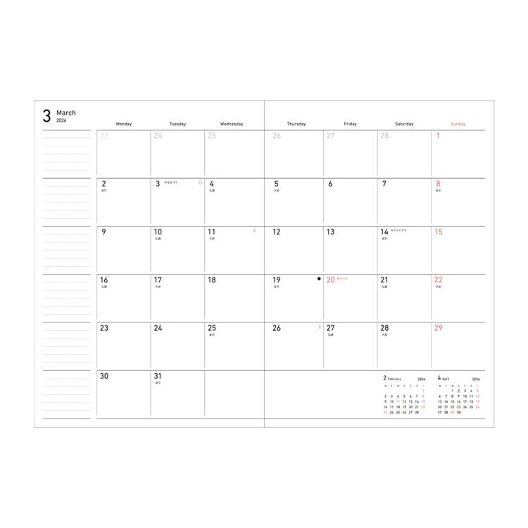 - (マンスリーページ)2025.12~2027.01、(ウィークリーページ)2025.12.01~2027.01.03