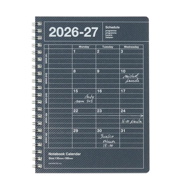●掲載内容・2026.04~2027.13(カレンダー12枚)・祝日表示(日・米・英・仏・伊・西・独・中国・香港・韓国 海外祝日はアイコン表示)・ウィークナンバー・罫線メモ(43ページ)
