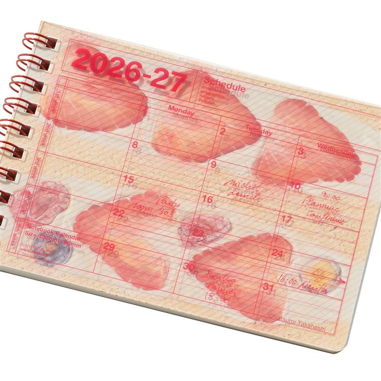 ●掲載内容・2026.04~2027.03(カレンダー12枚)・祝日表示(日・米・英・仏・伊・西・独・中国・香港・韓国 海外祝日はアイコン表示)・ウィークナンバー・罫線メモ(43ページ)