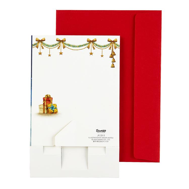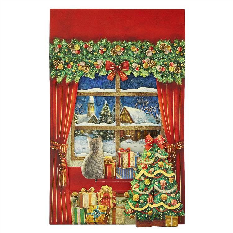 クリスマスの窓辺の風景を重厚感のあるデザインで表現しました。手前のツリーから、窓枠、背景へとたくさんの層が重なり合って、奥行きをお楽しみいただけます。全面に金箔加工が施された華やな仕上がりです。立てて飾れます。カードの裏側にメッセージスペースがあります。