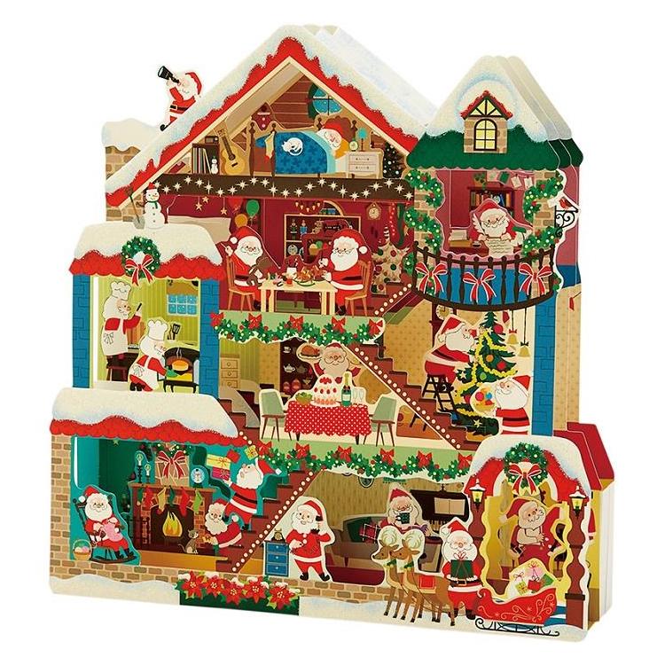 おもちゃの工房や書斎、キッチン、屋根裏の寝室など、サンタたちの暮らしが細かく描かれています。3層構造で各部屋の立体的な空間をお楽しみいただけます。すみずみまでじっくり眺めたくなる、ミニチュア感たっぷりのドールハウスのようなカードです。立てて飾れます。裏側にメッセージスペースがあります。