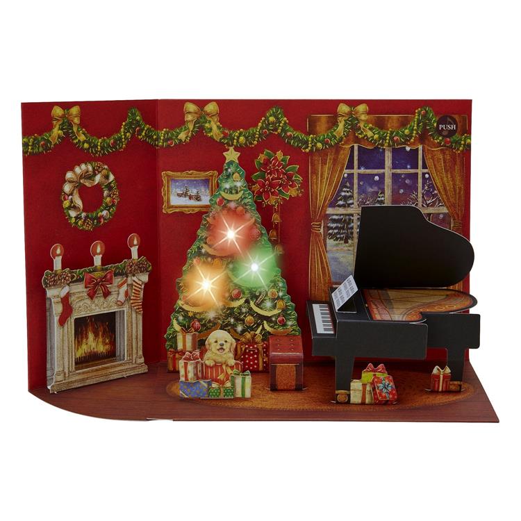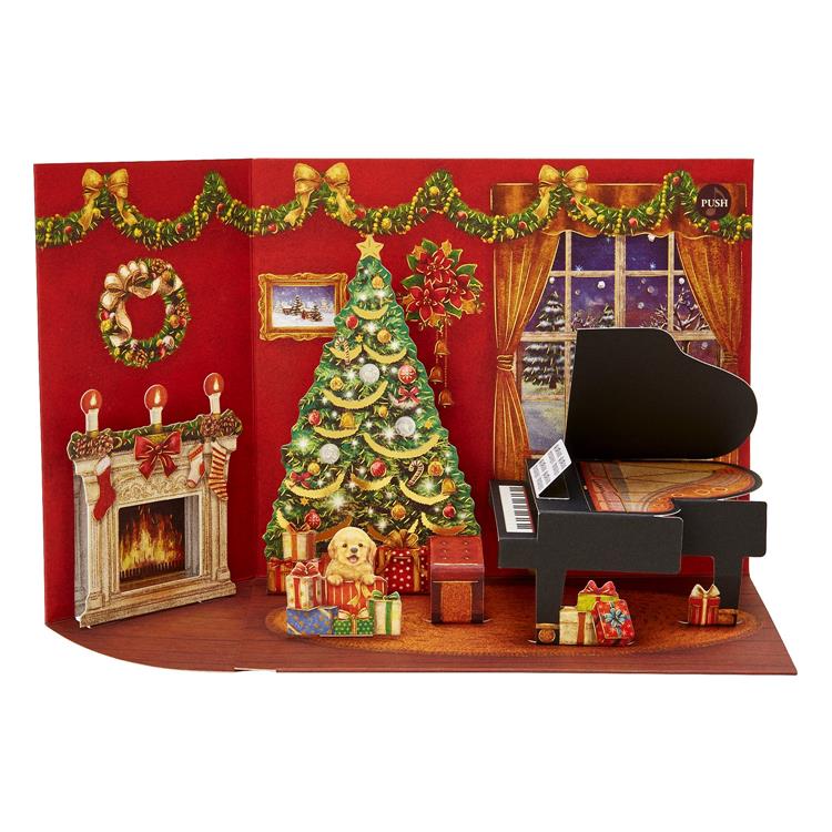 クリスマスカード ライト&メロディー 赤い部屋とピアノ